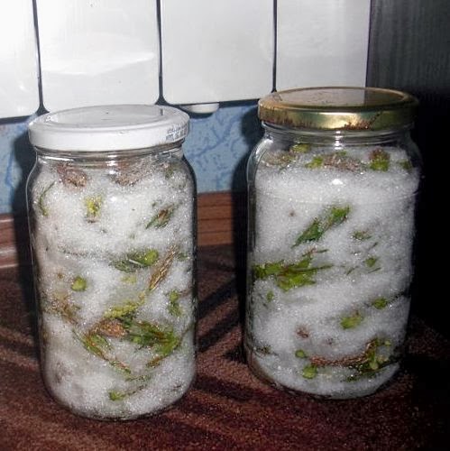 2. Następnie w słoiku układamy na przemian warstwy pędów i cukru (warstwę pędów grubości 3 cm posypujemy 4 łyżeczkami cukru). Na koniec można dodać odrobinę wody.